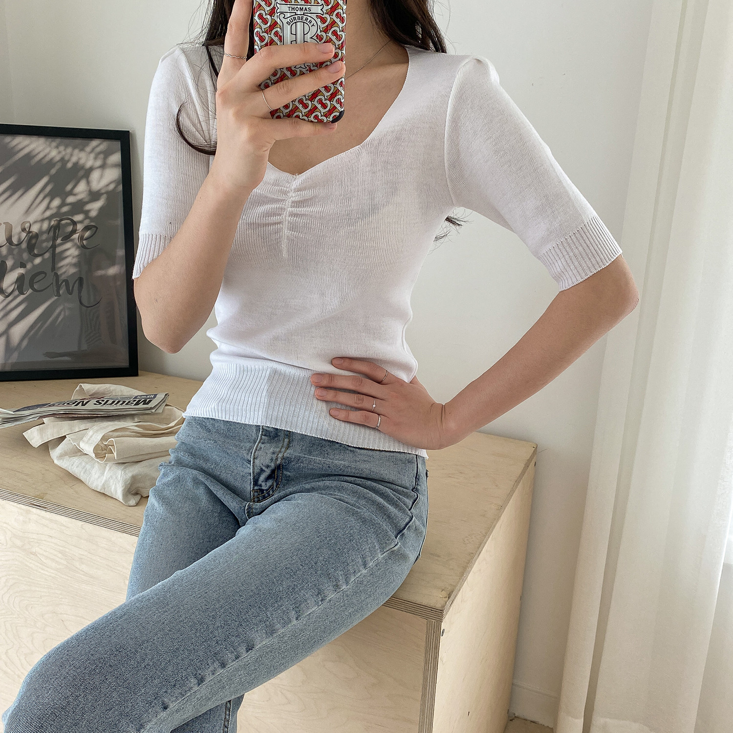 바스트라인의 셔링 포인트가 글래머스한 효과를 주는 여름니트예요.