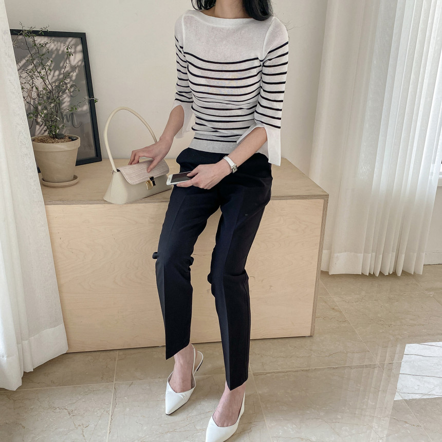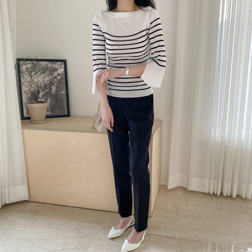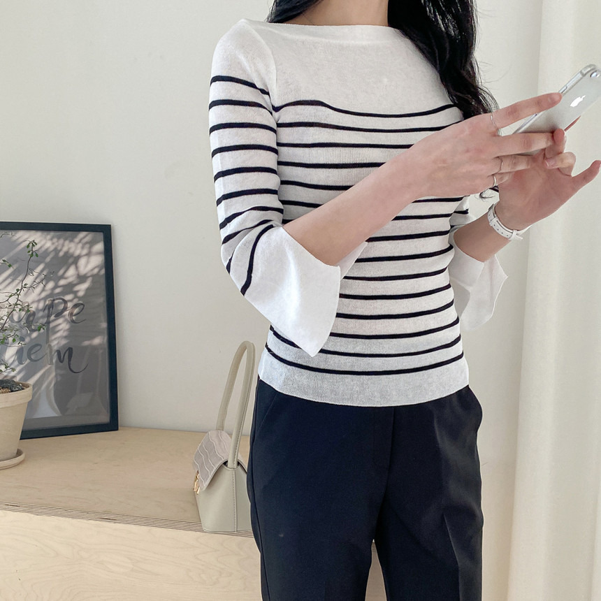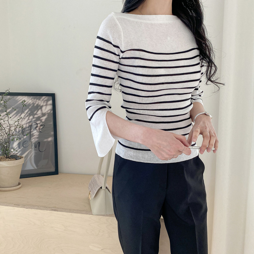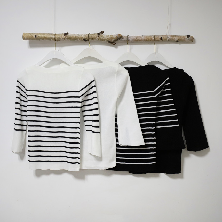 여리여리한 쇄골라인이 돋보이는 여성스러운 보트네크라인의 봄니트예요.