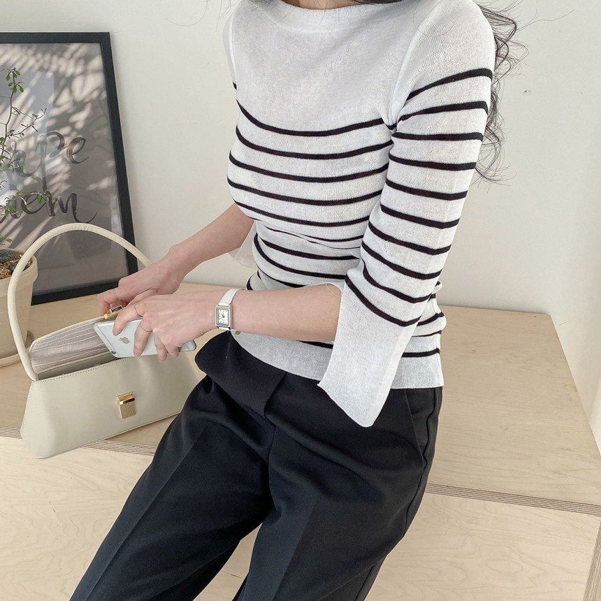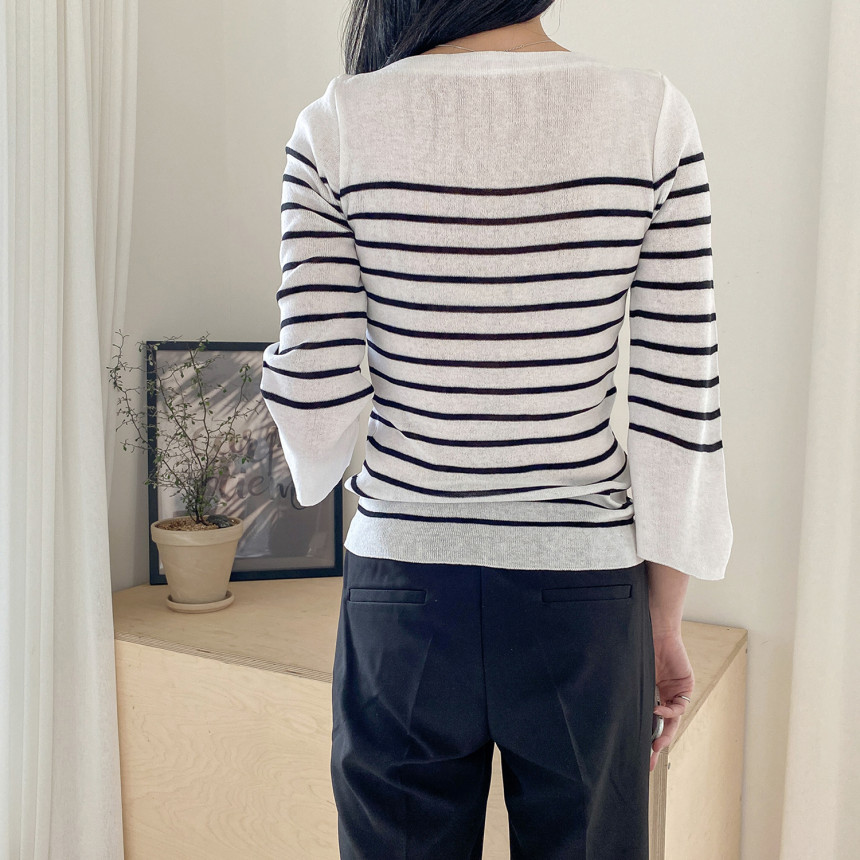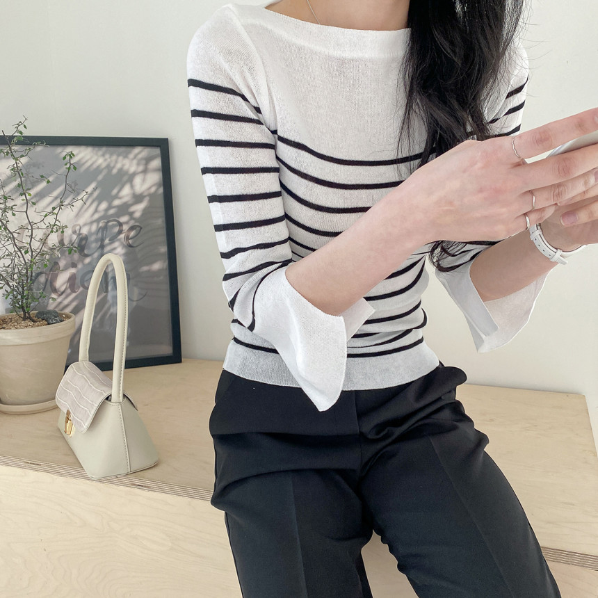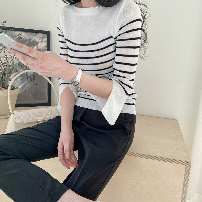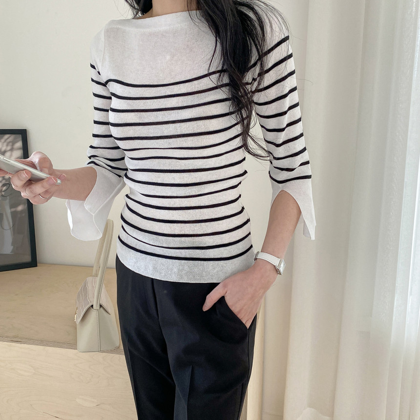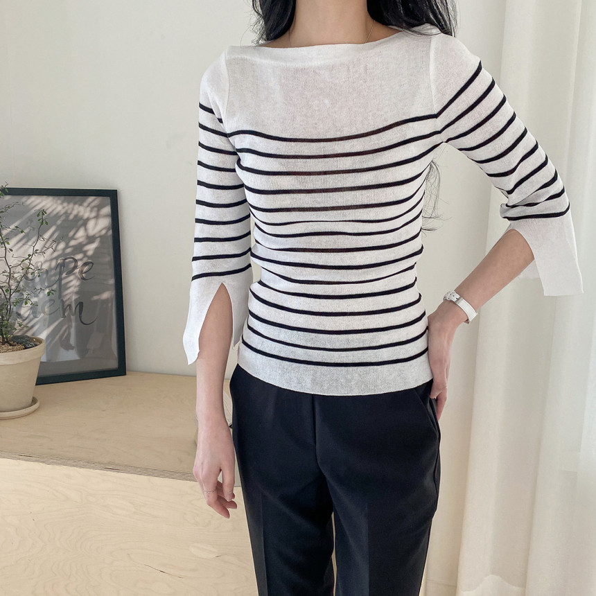 여리여리한 쇄골라인이 돋보이는 여성스러운 보트네크라인의 봄니트예요.