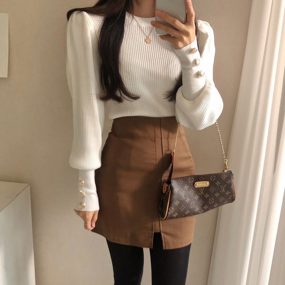 여성스러우면서도 귀여운 퍼프소매 니트예요.