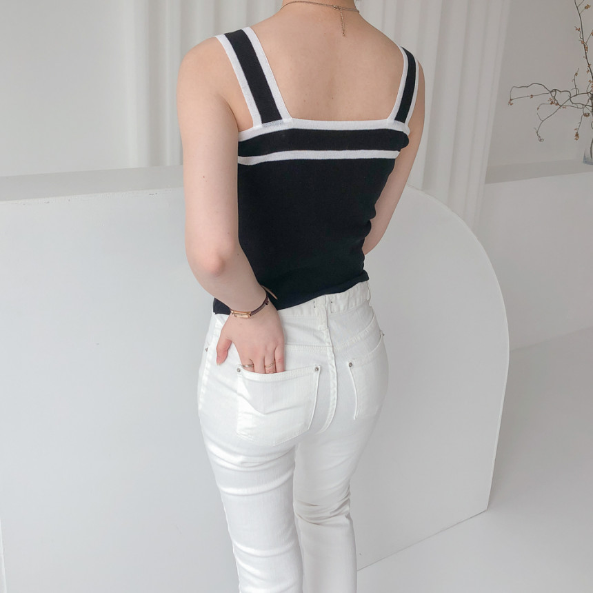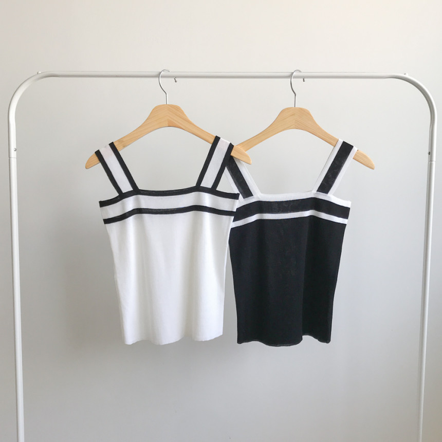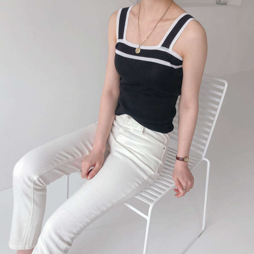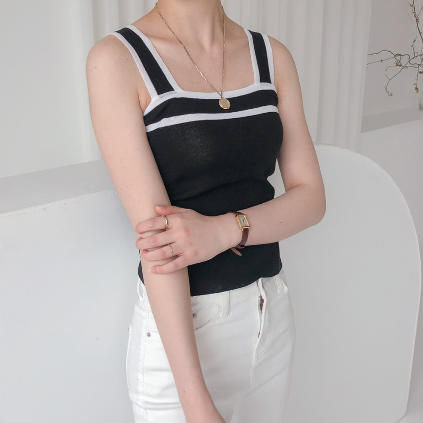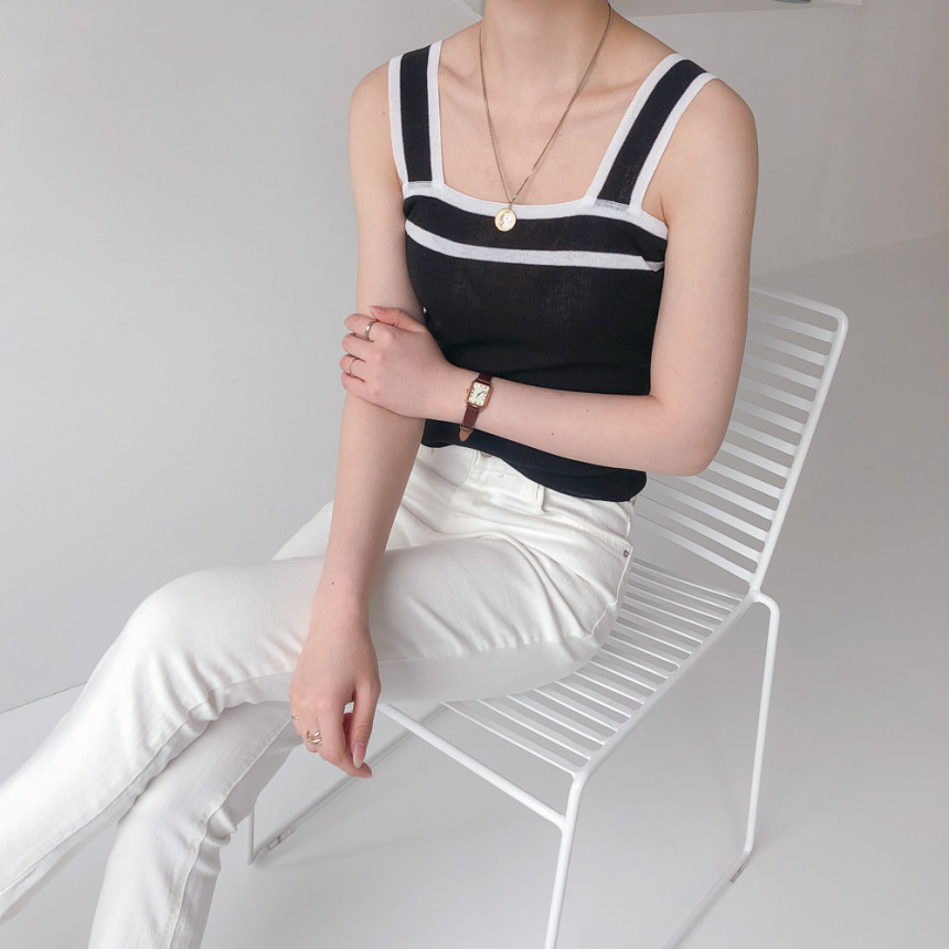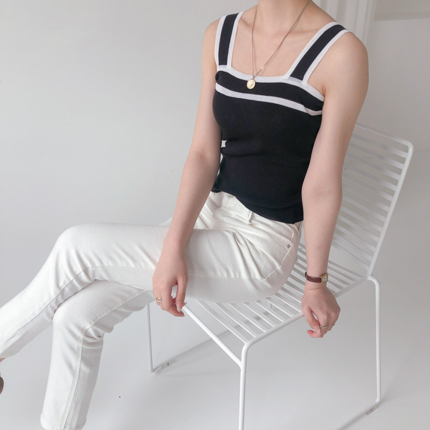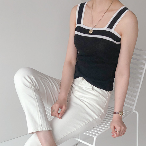 배색디테일이 유니크한 민소매 니트예요.