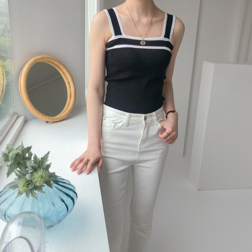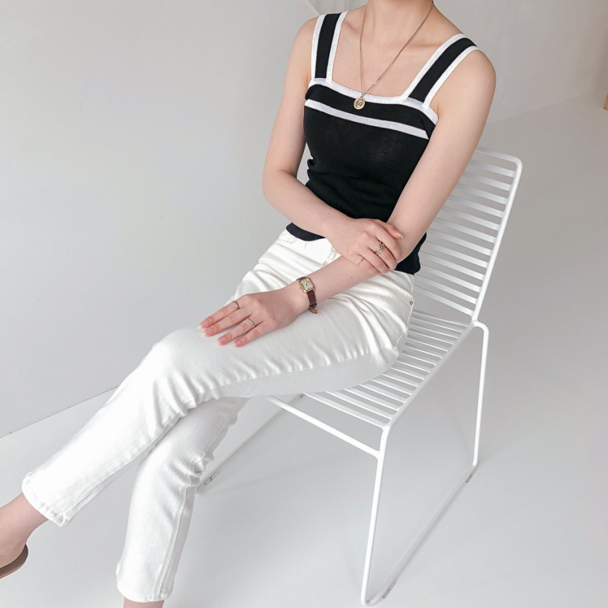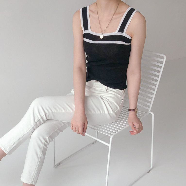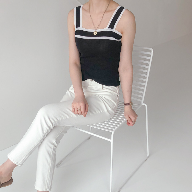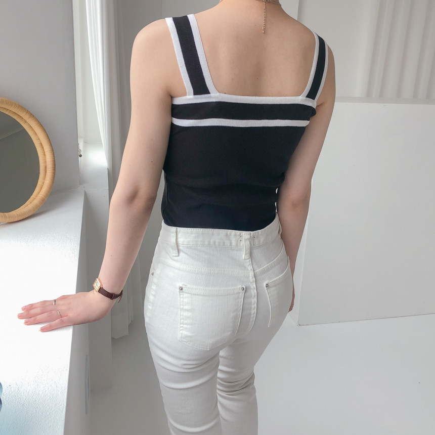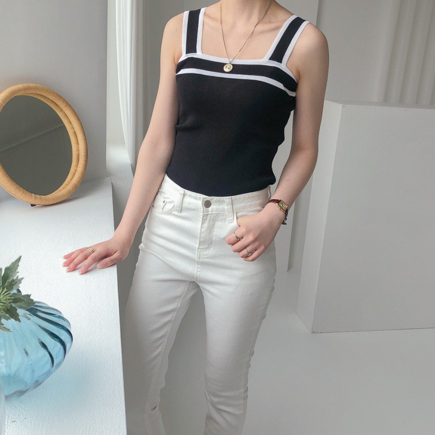 배색디테일이 유니크한 민소매 니트예요.