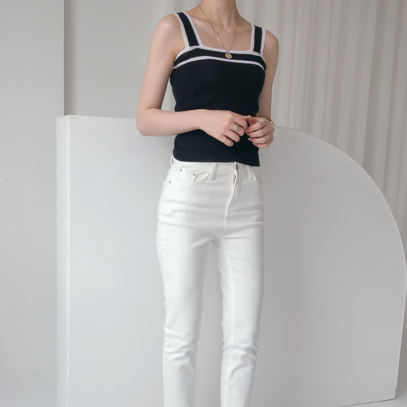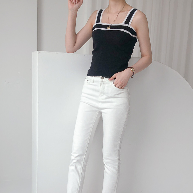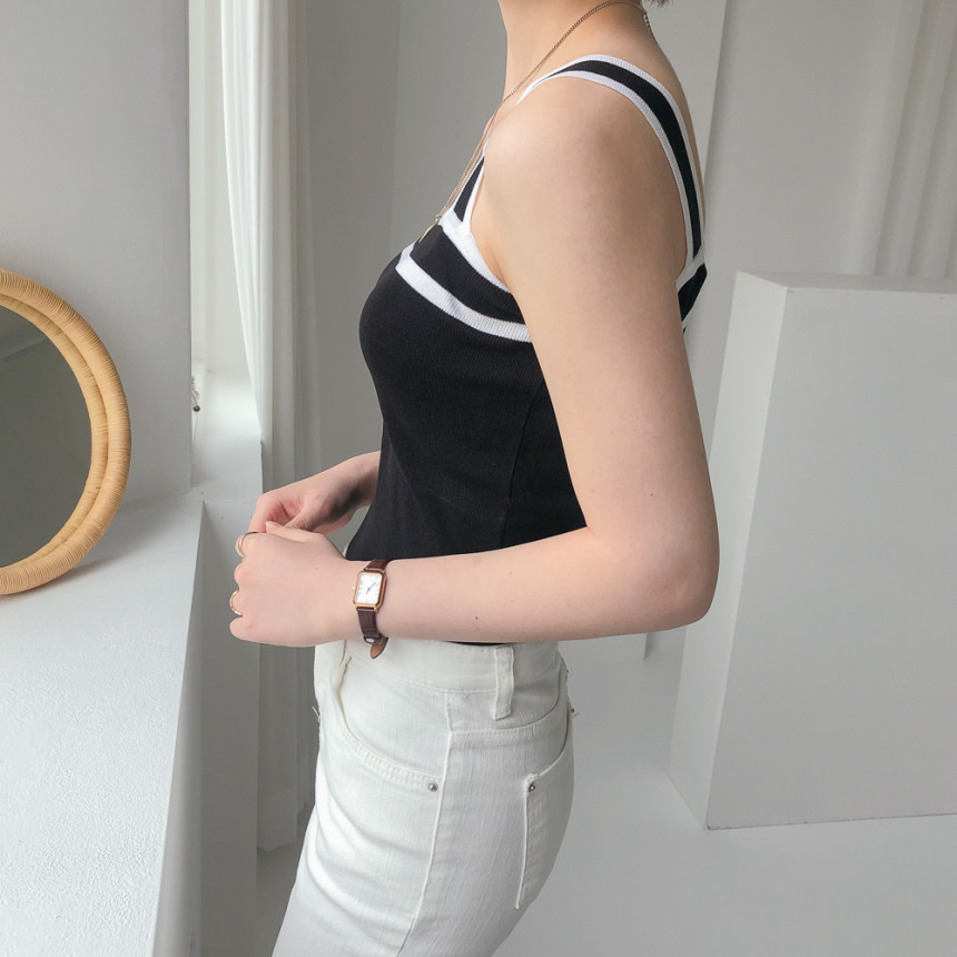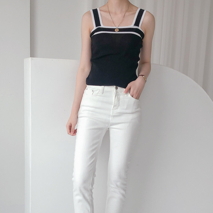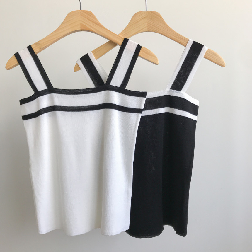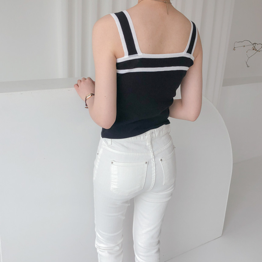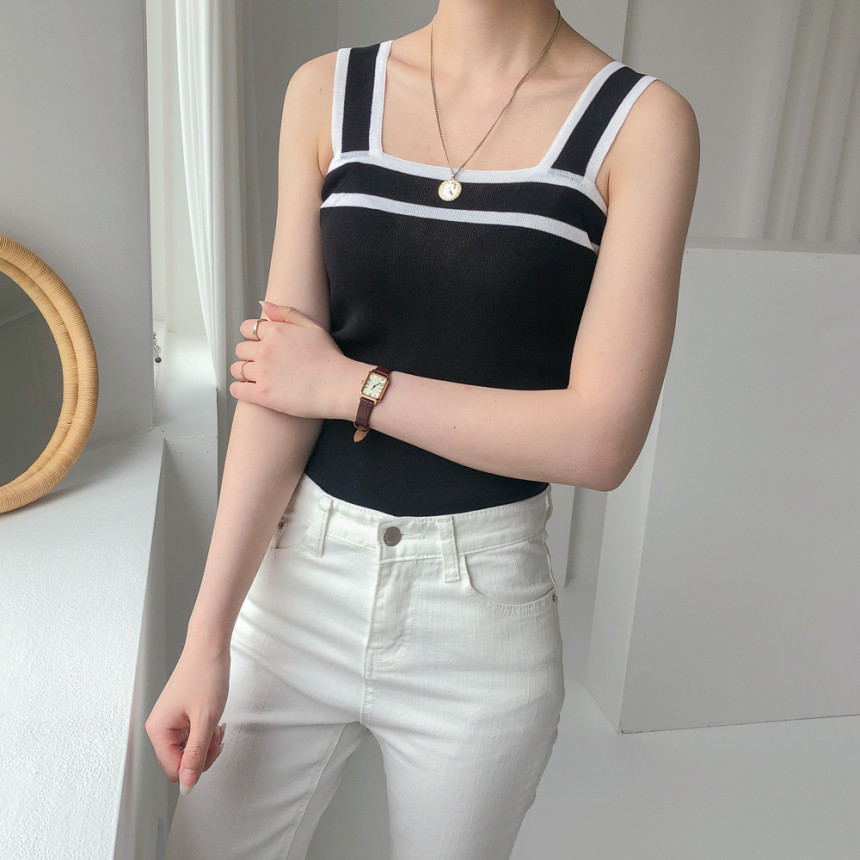배색디테일이 유니크한 민소매 니트예요.