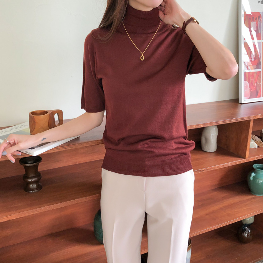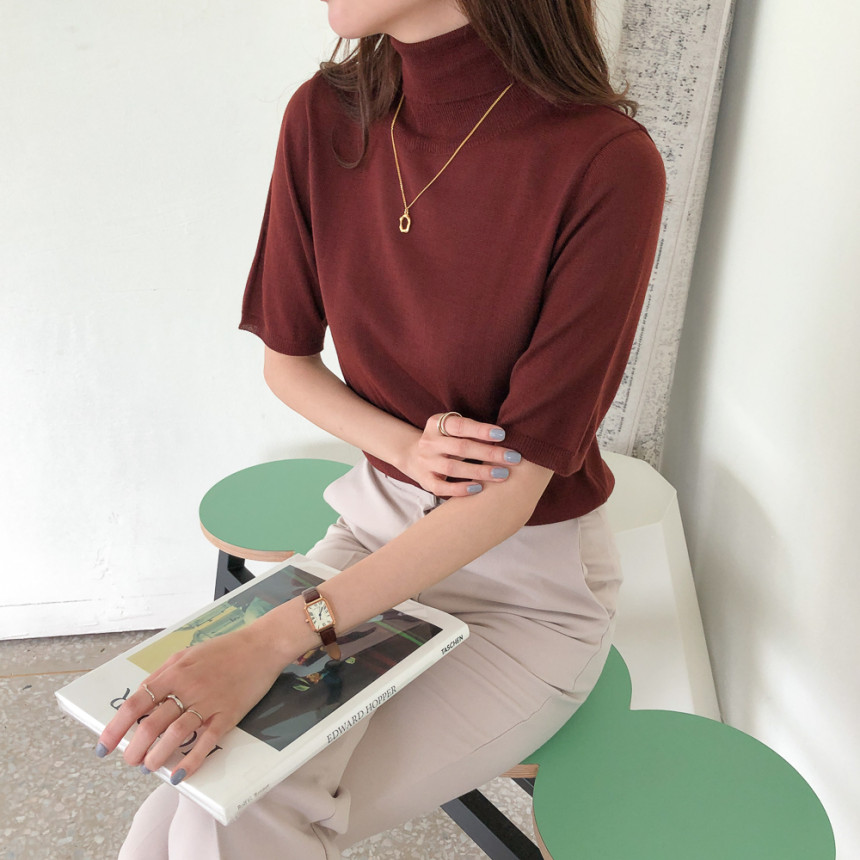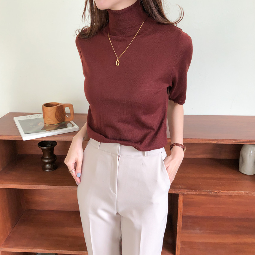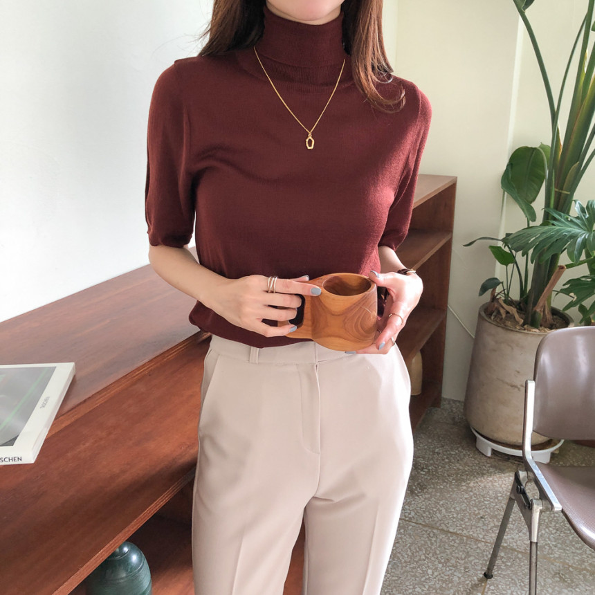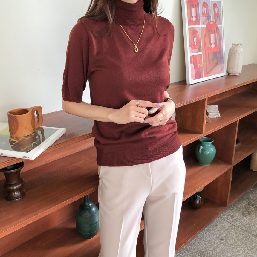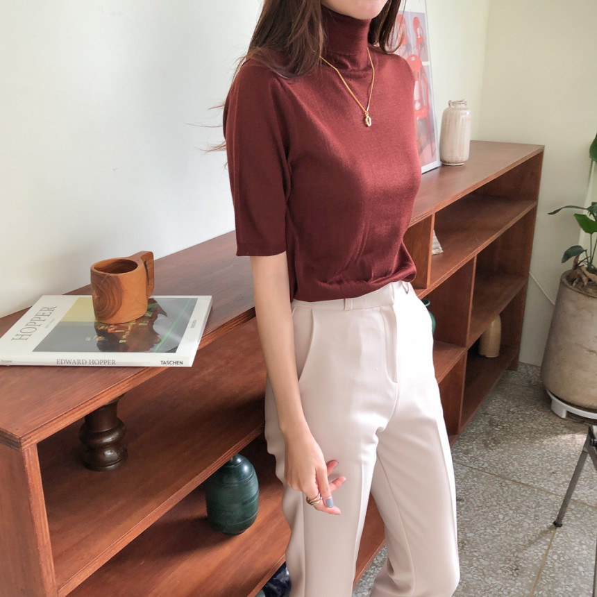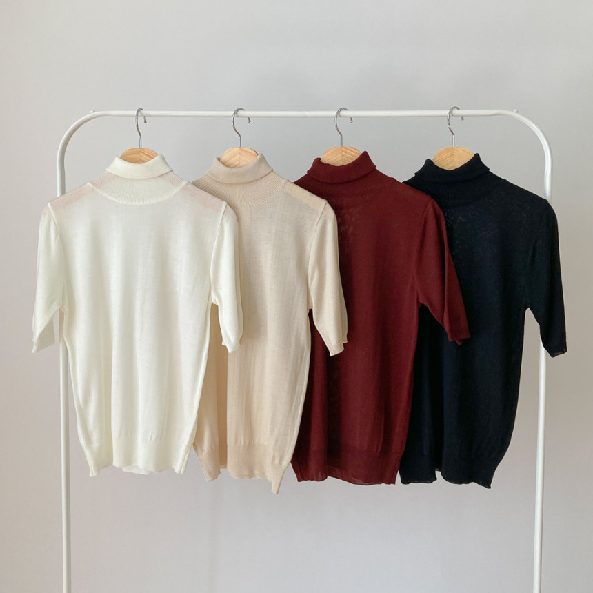 하이넥으로 올라오는 네크라인의 5부소매니트예요.