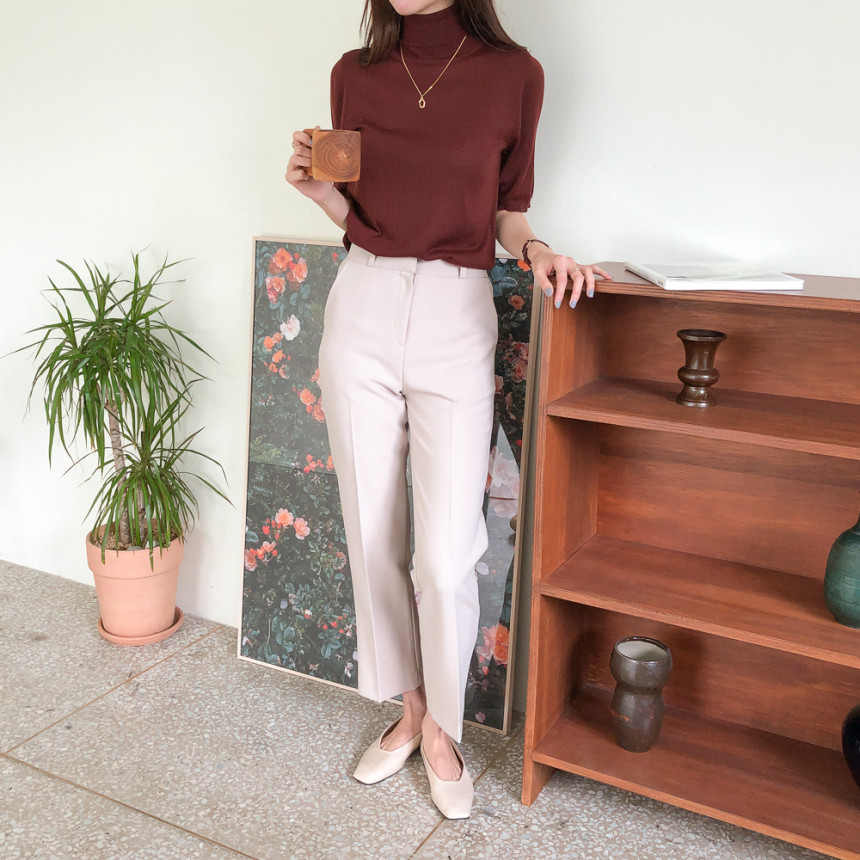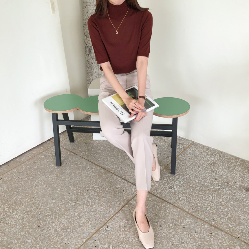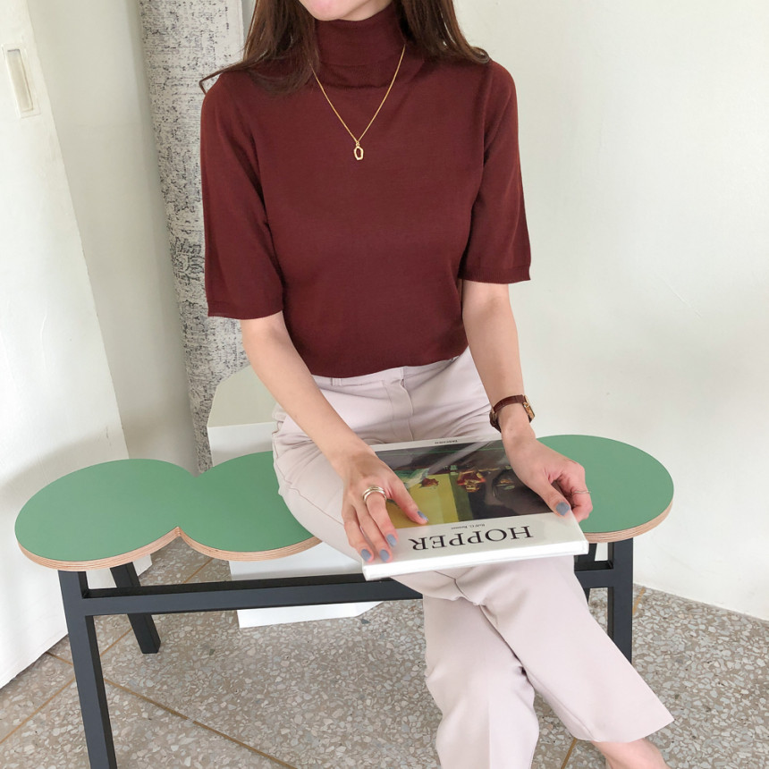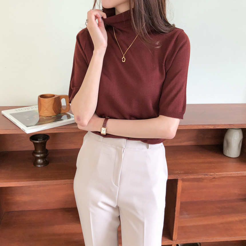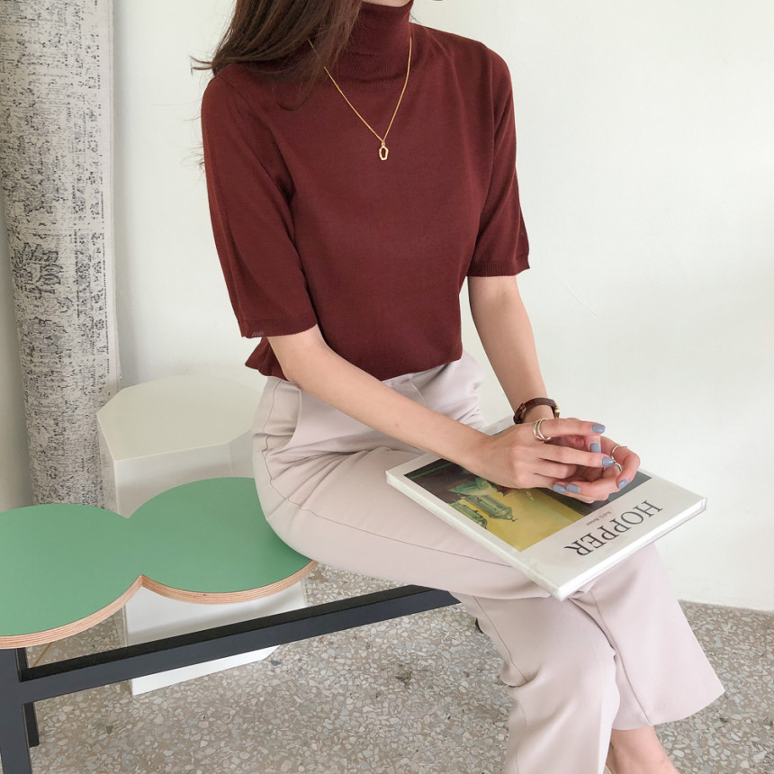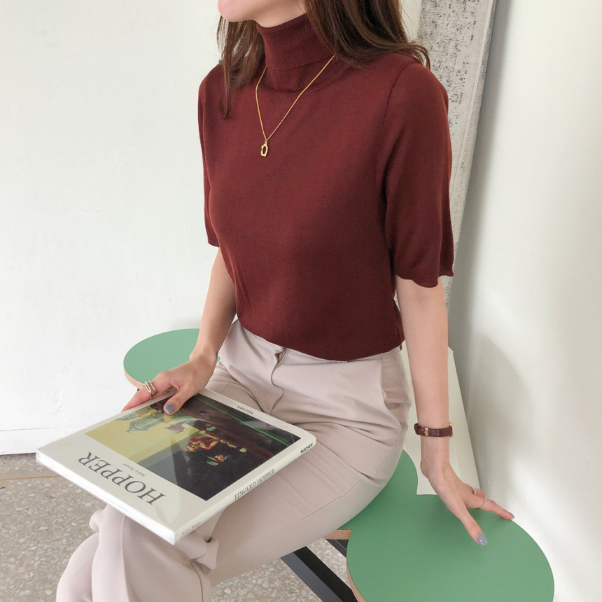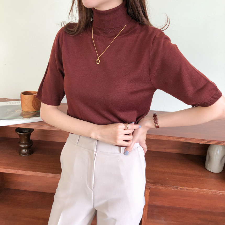 하이넥으로 올라오는 네크라인의 5부소매니트예요.