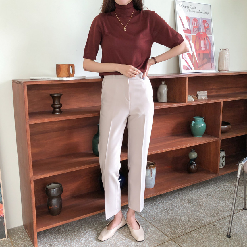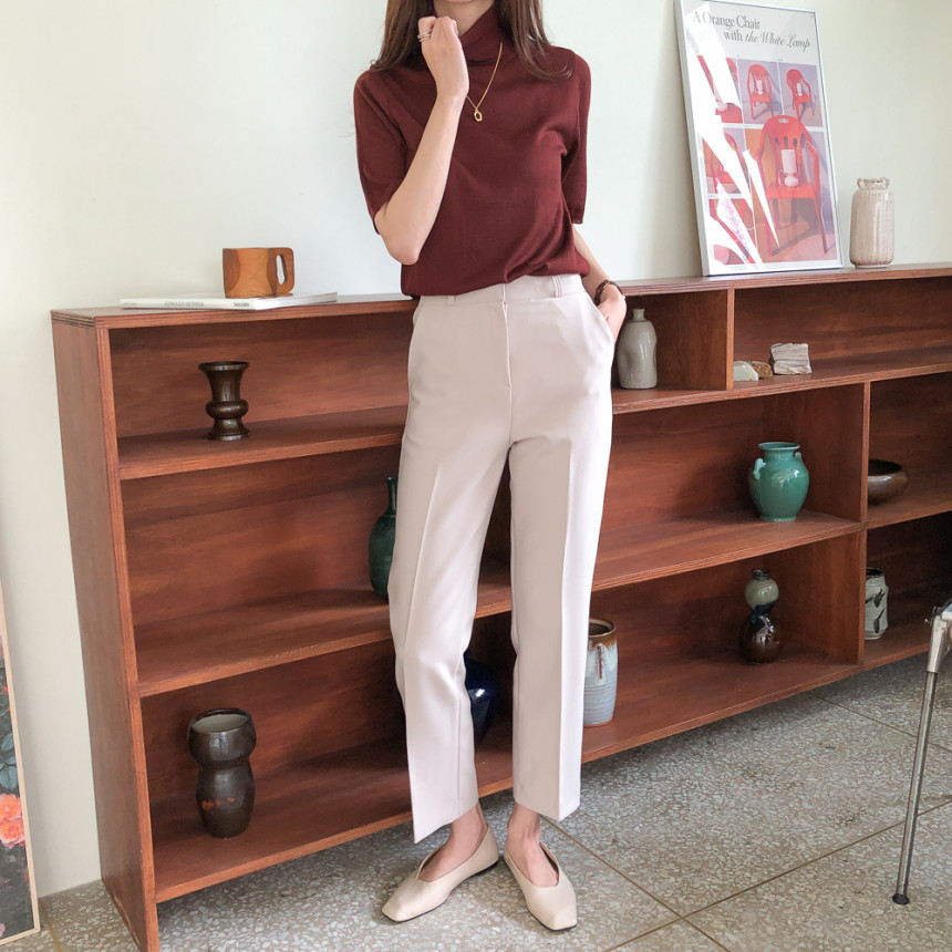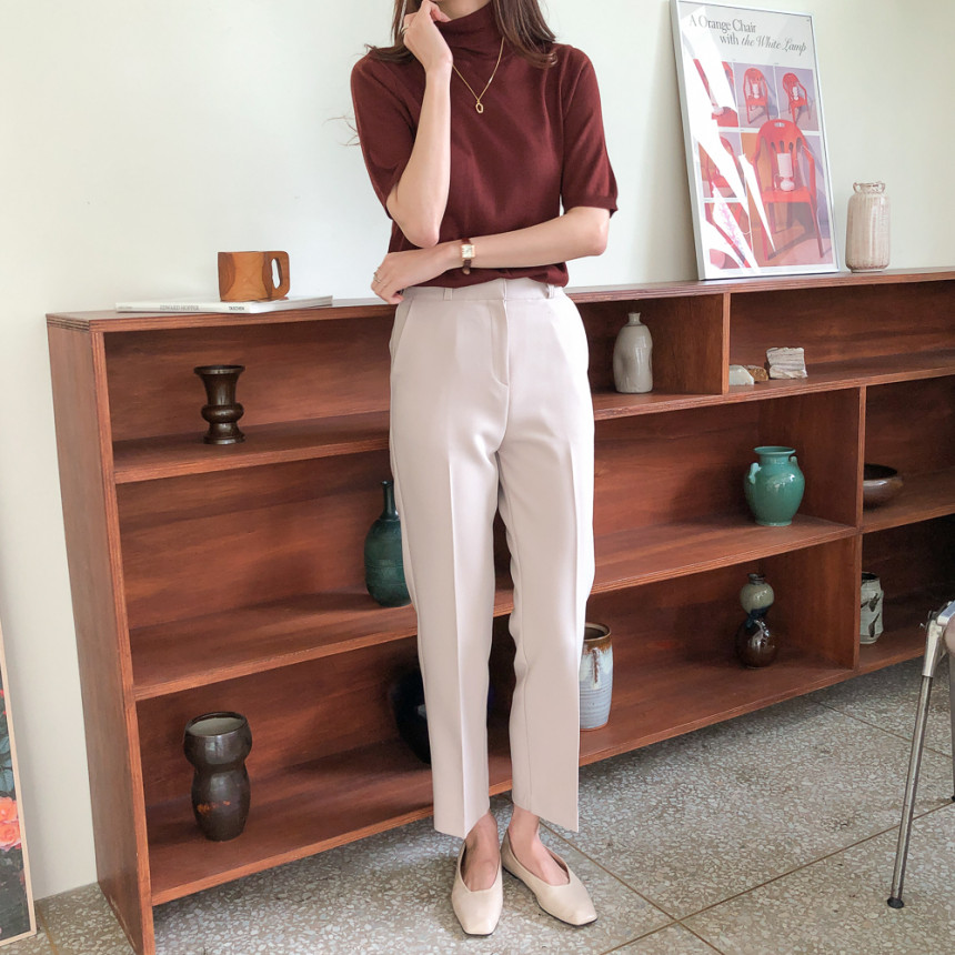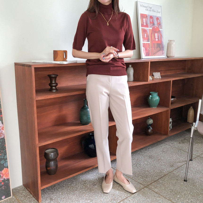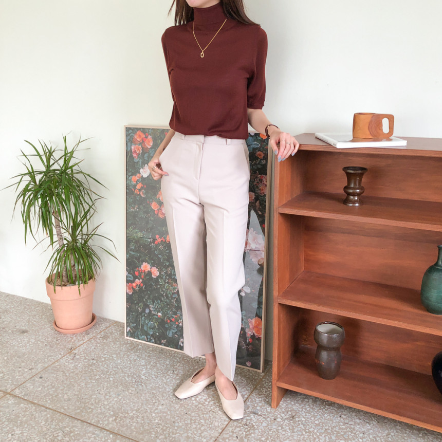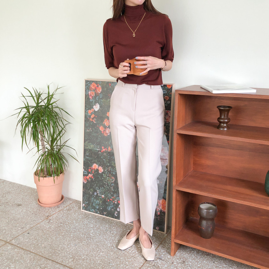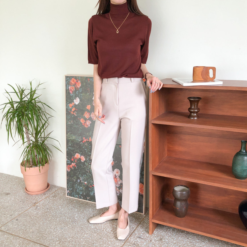 하이넥으로 올라오는 네크라인의 5부소매니트예요.
