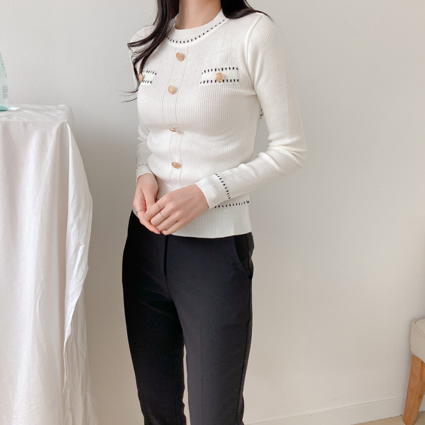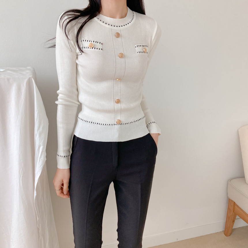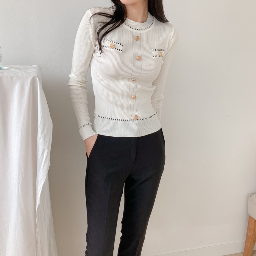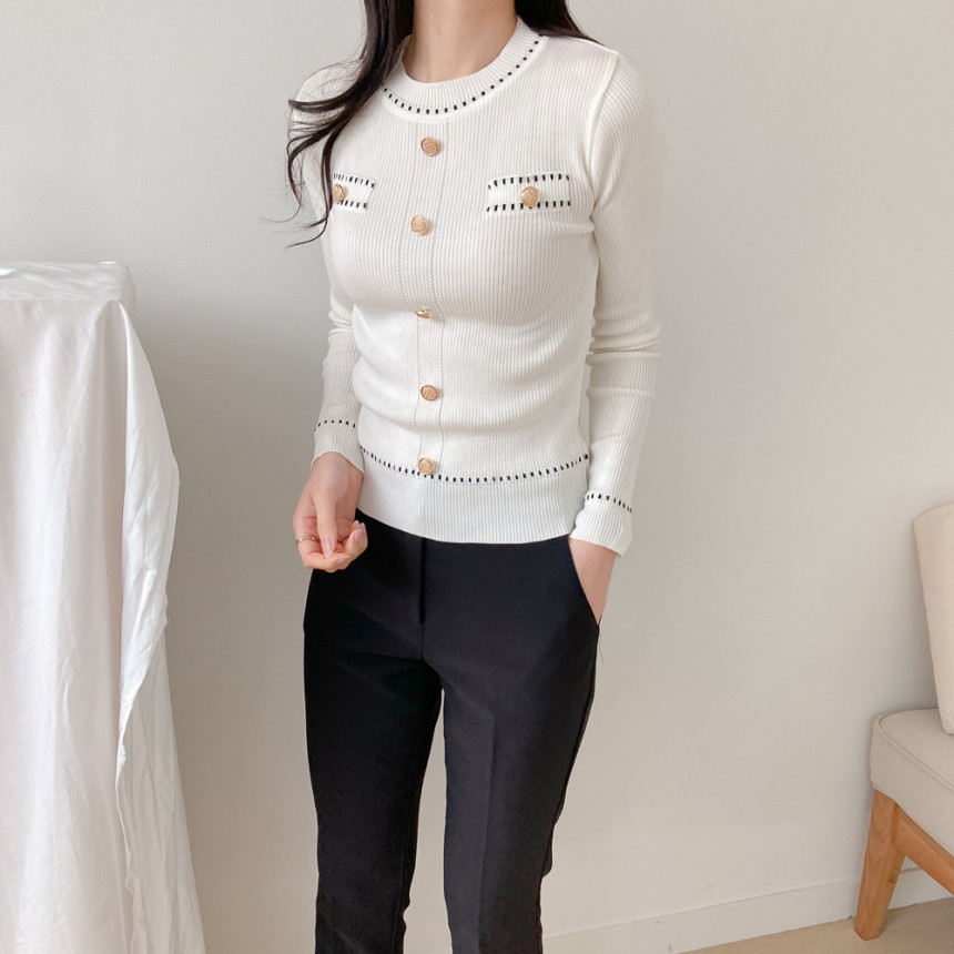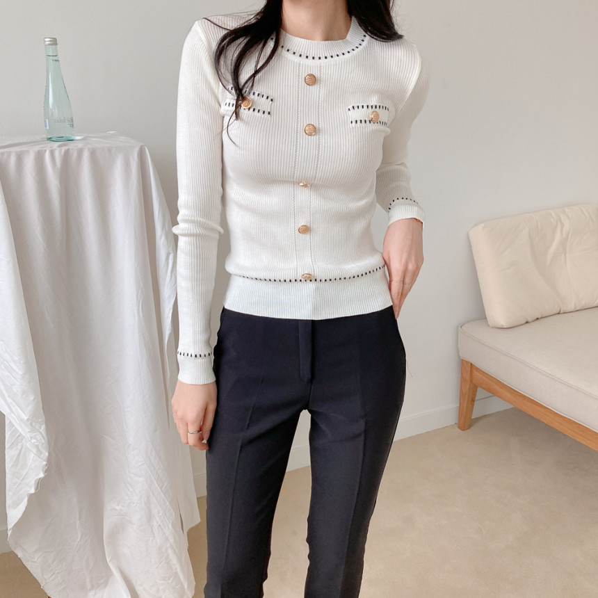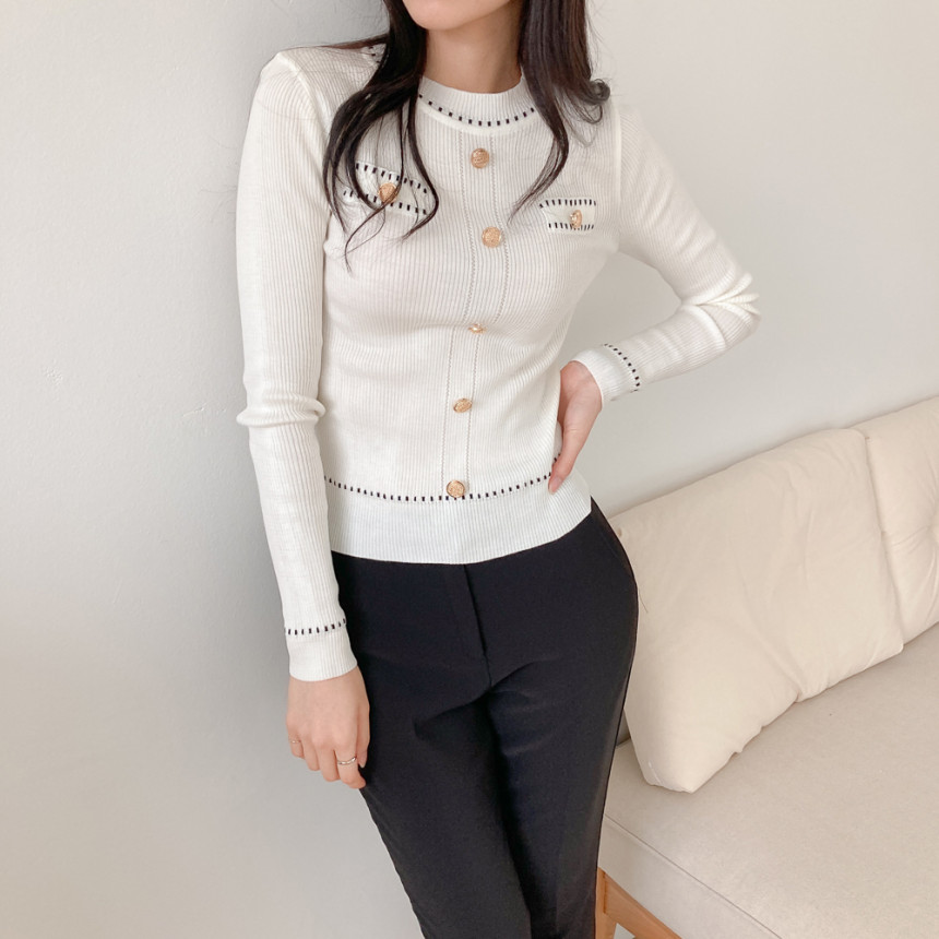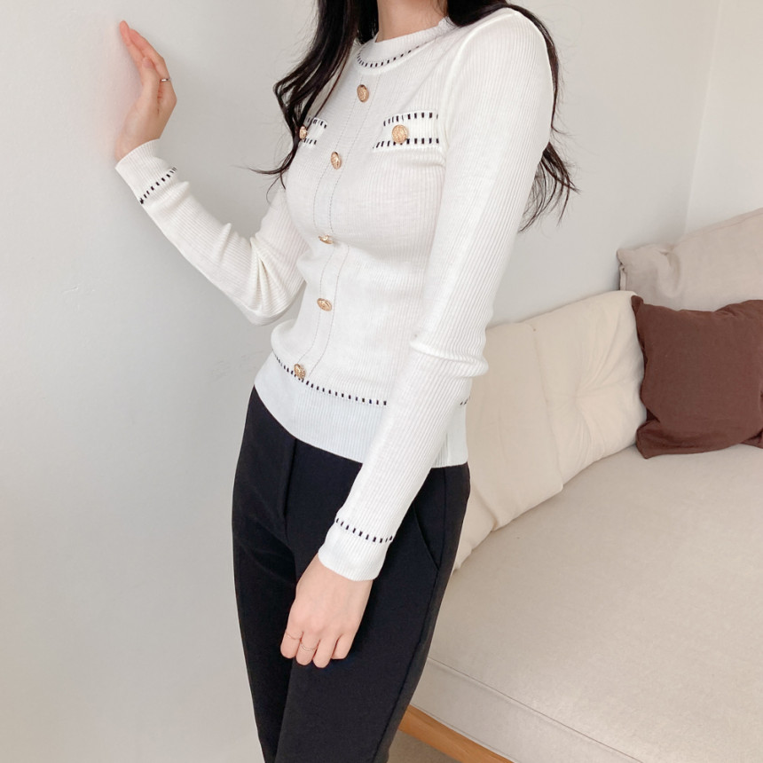 스티치금장버튼라운드니트_화이트