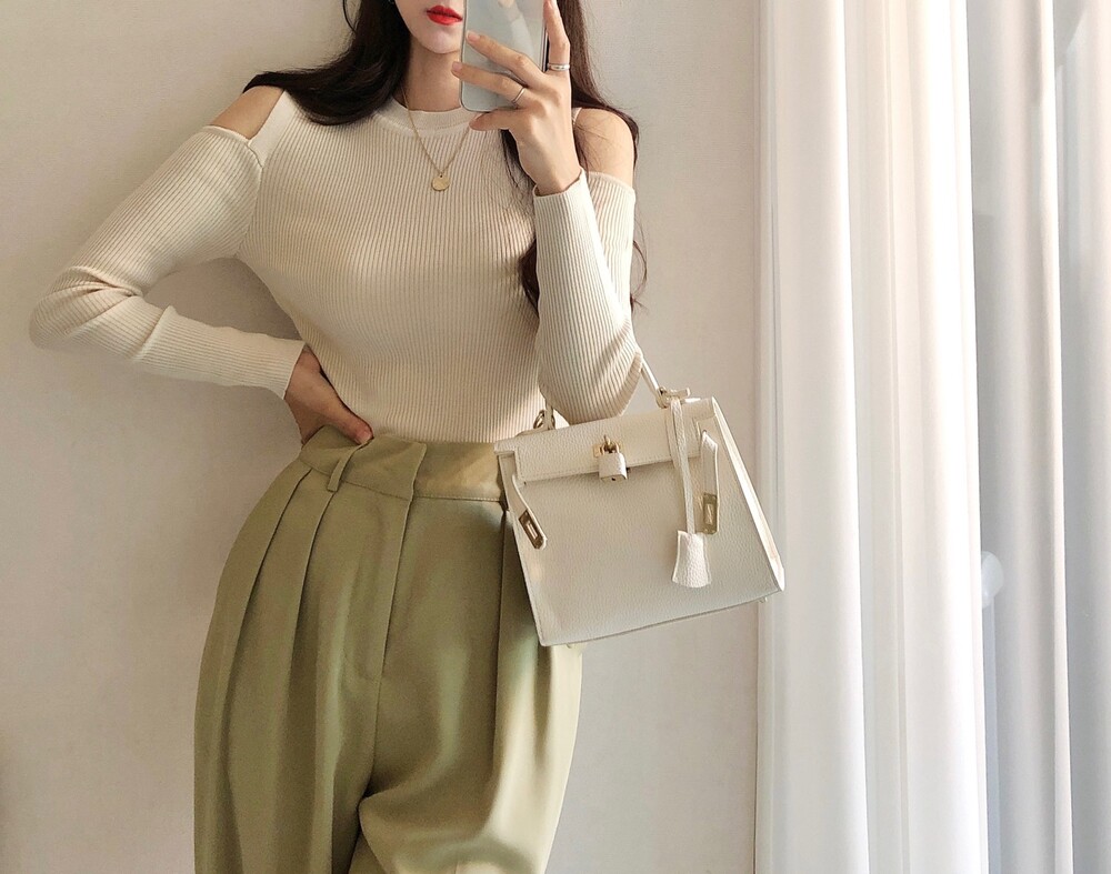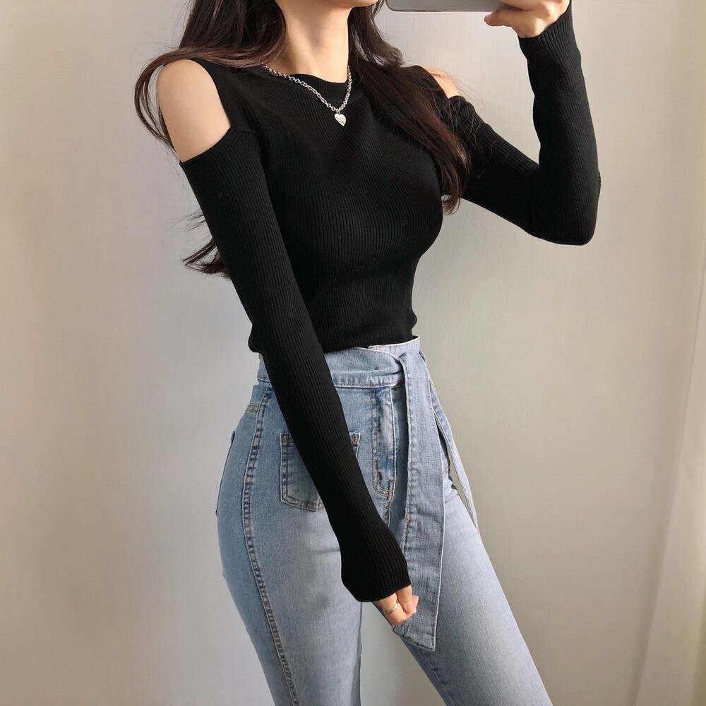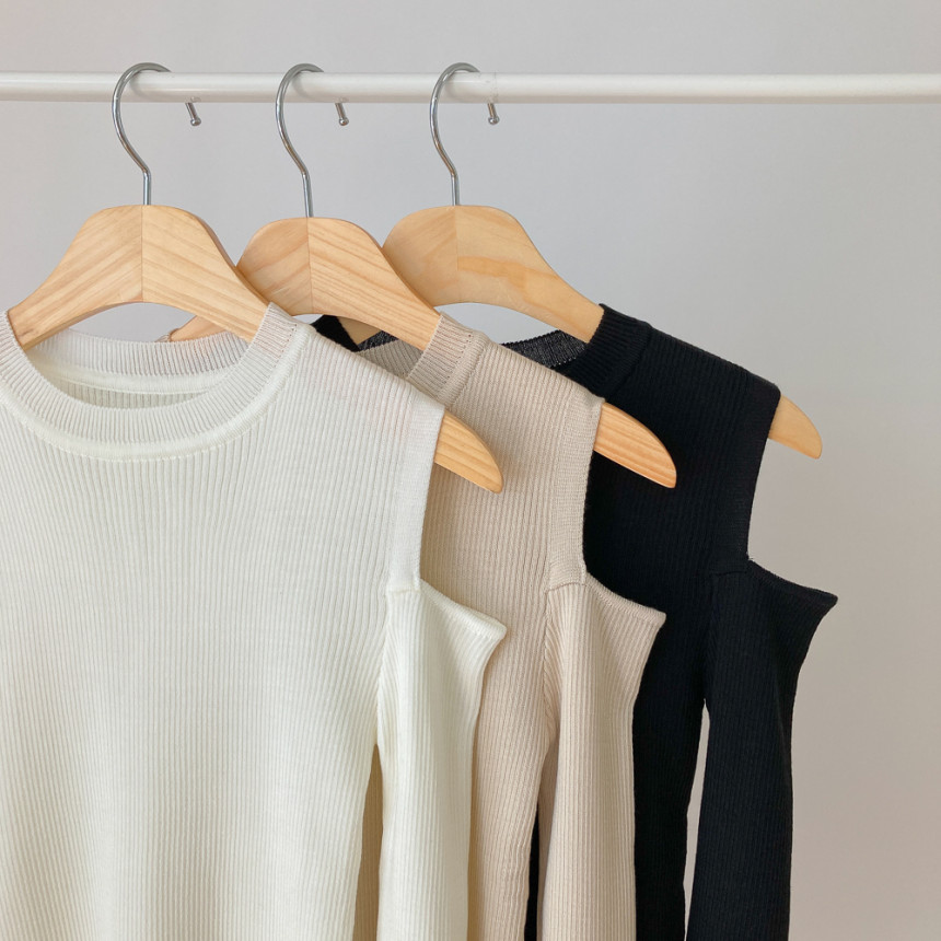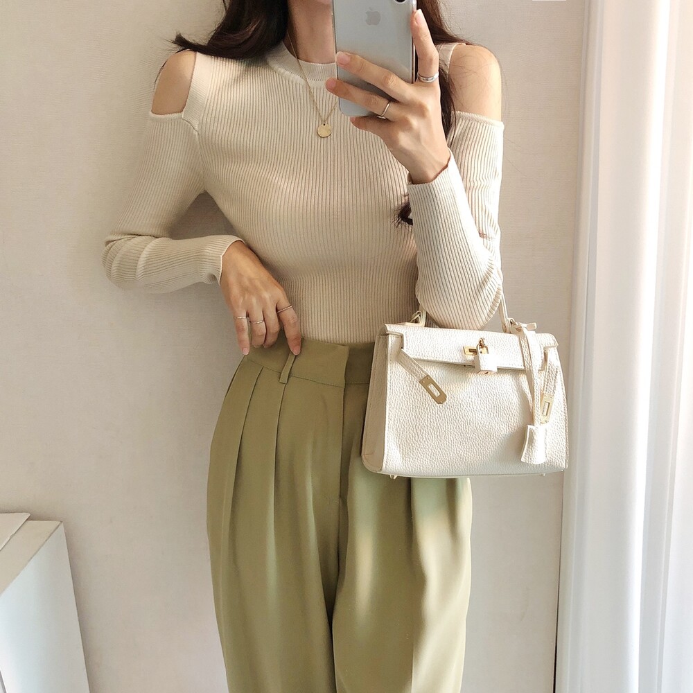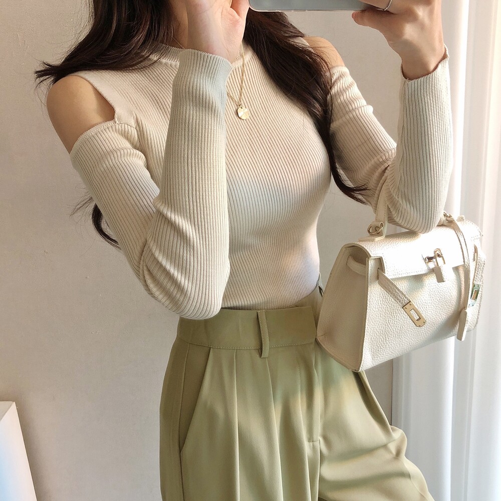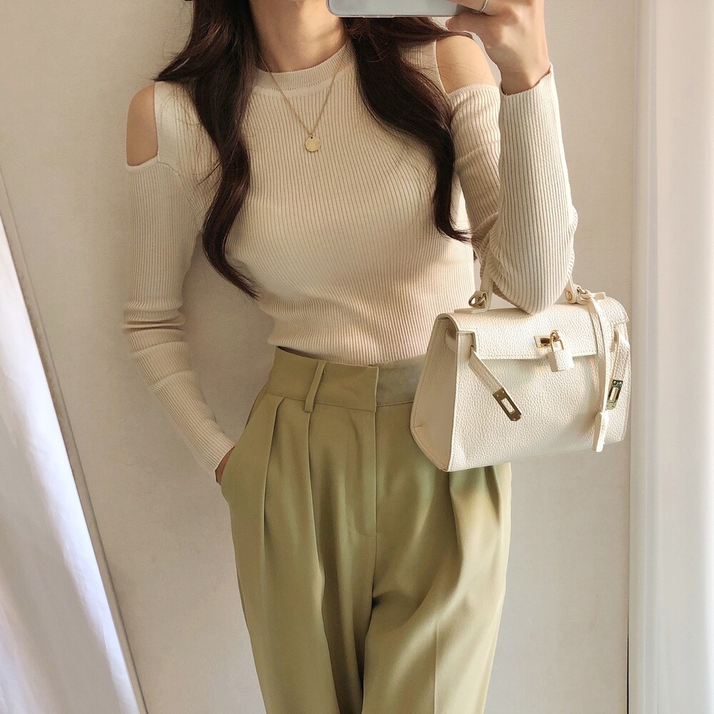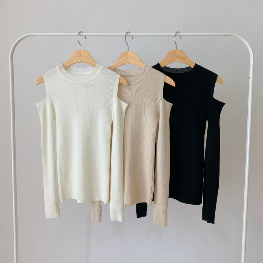 섹시하고 페미닌한 스타일의 어깨트임라운트 니트예요.