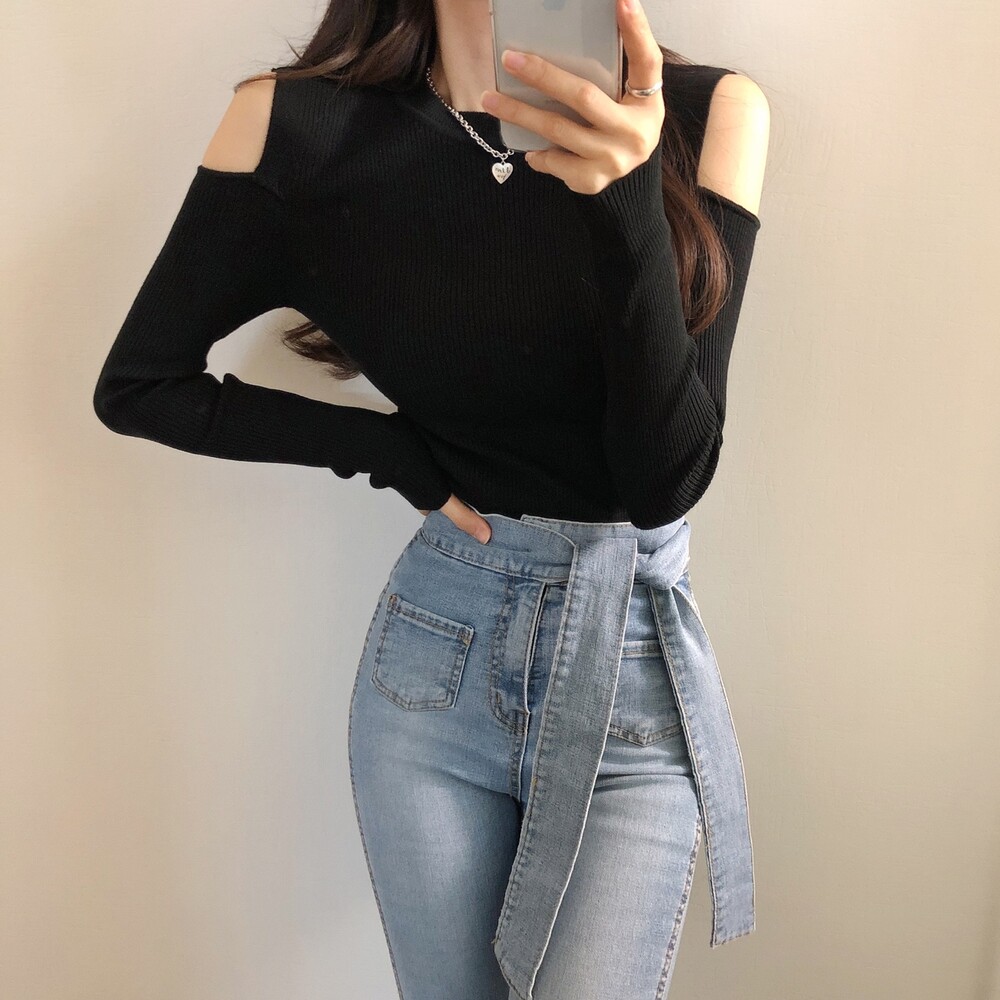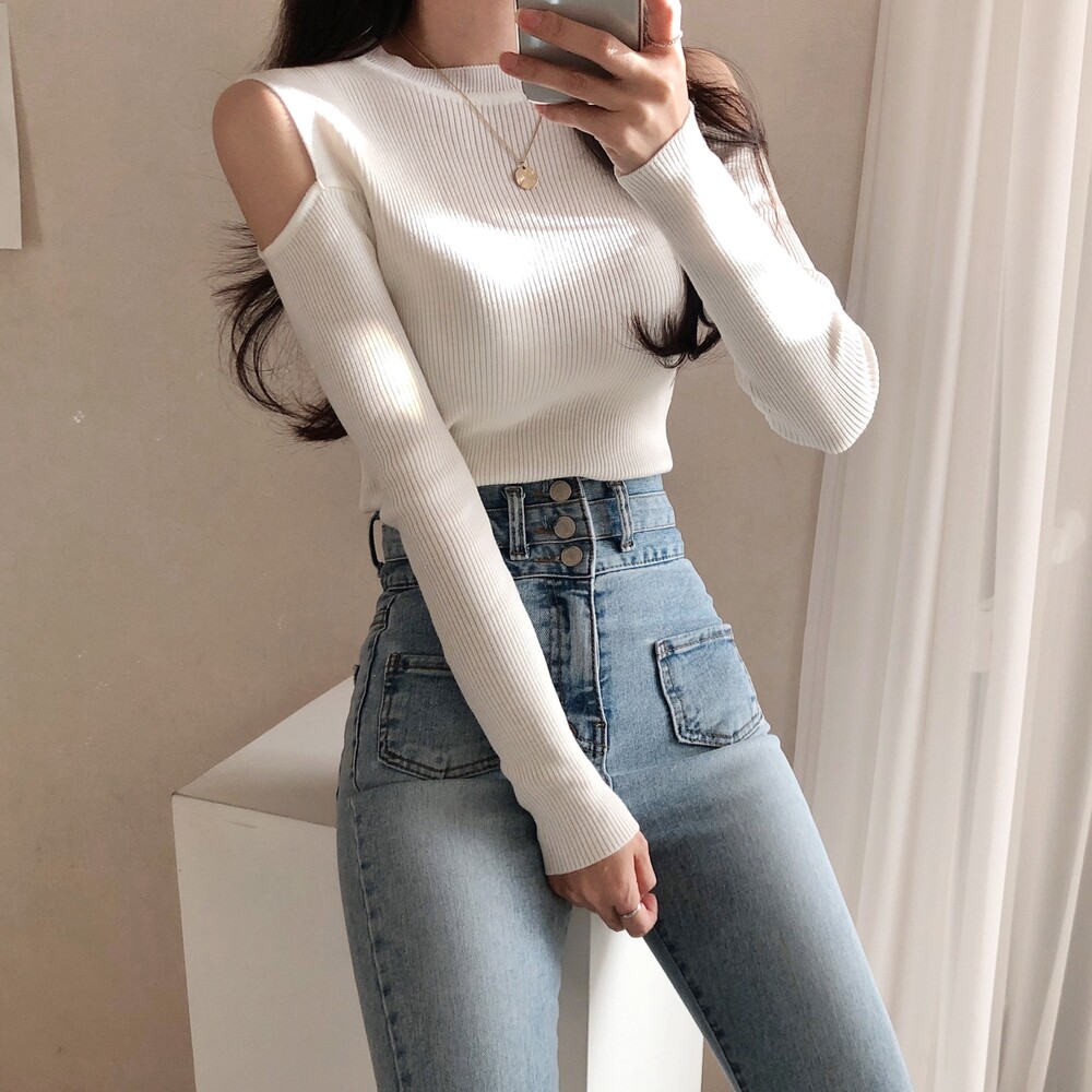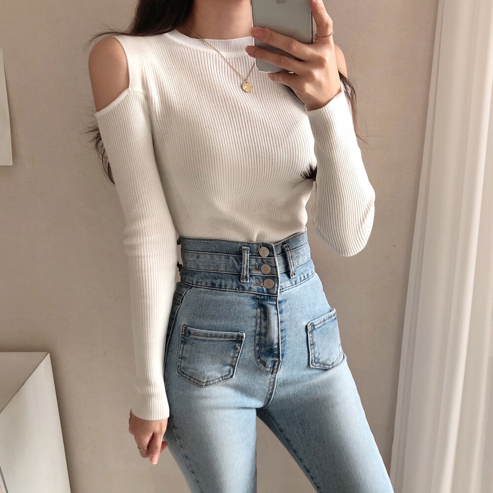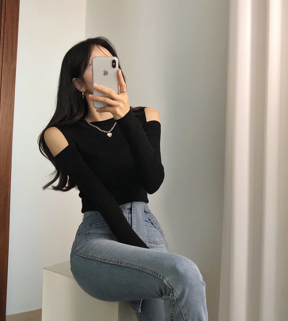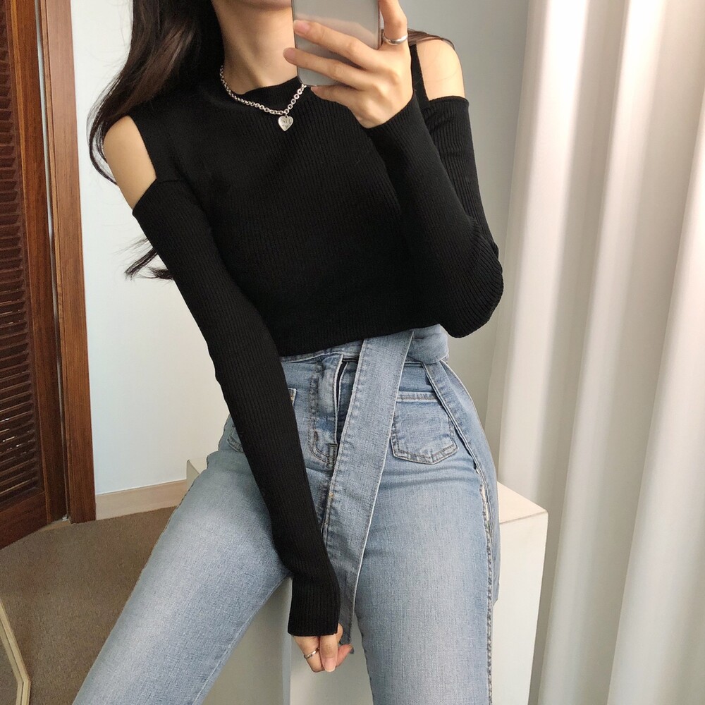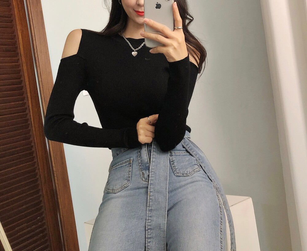 섹시하고 페미닌한 스타일의 어깨트임라운트 니트예요.
