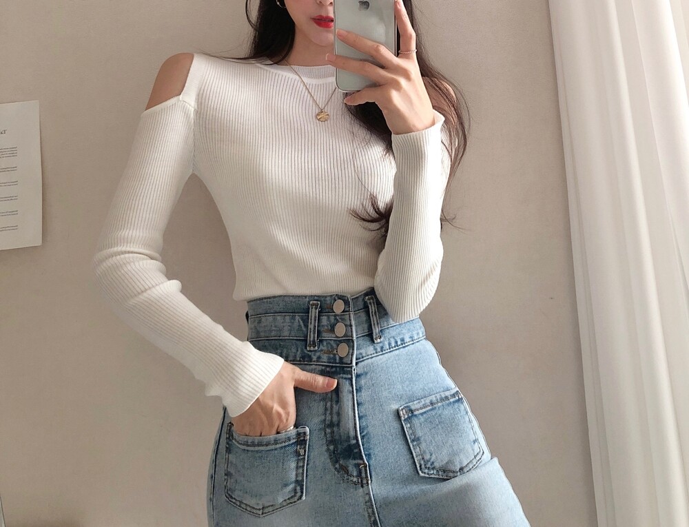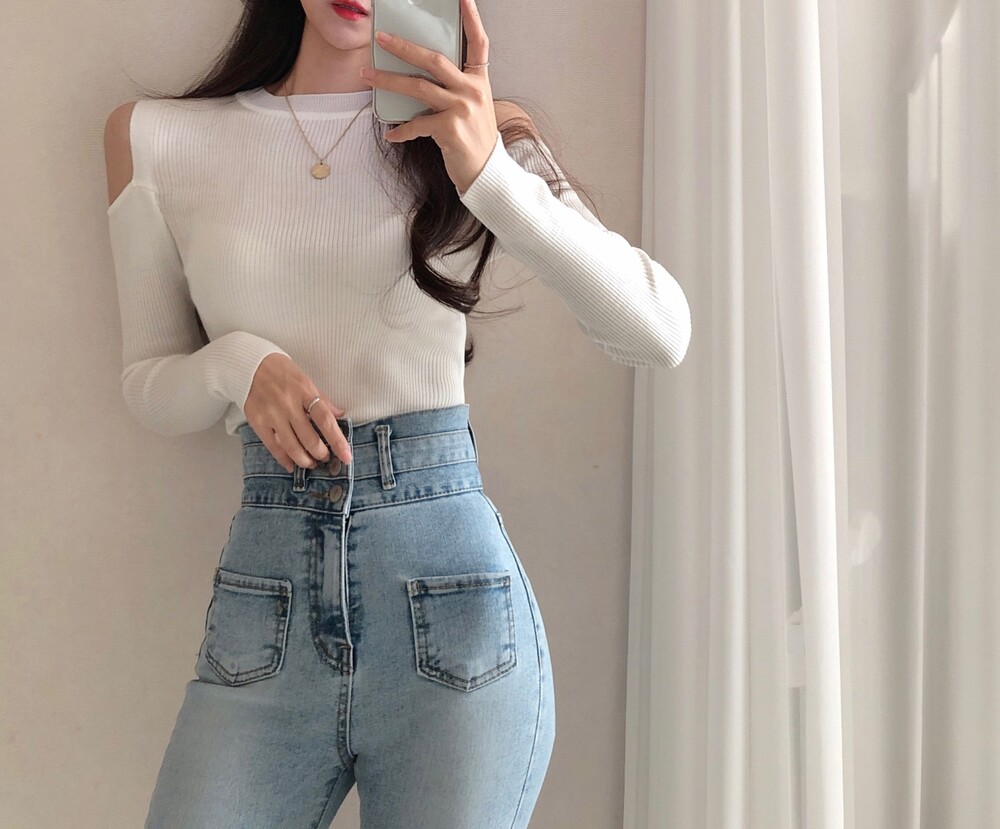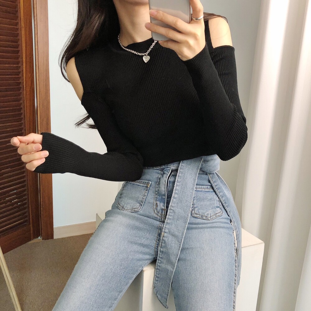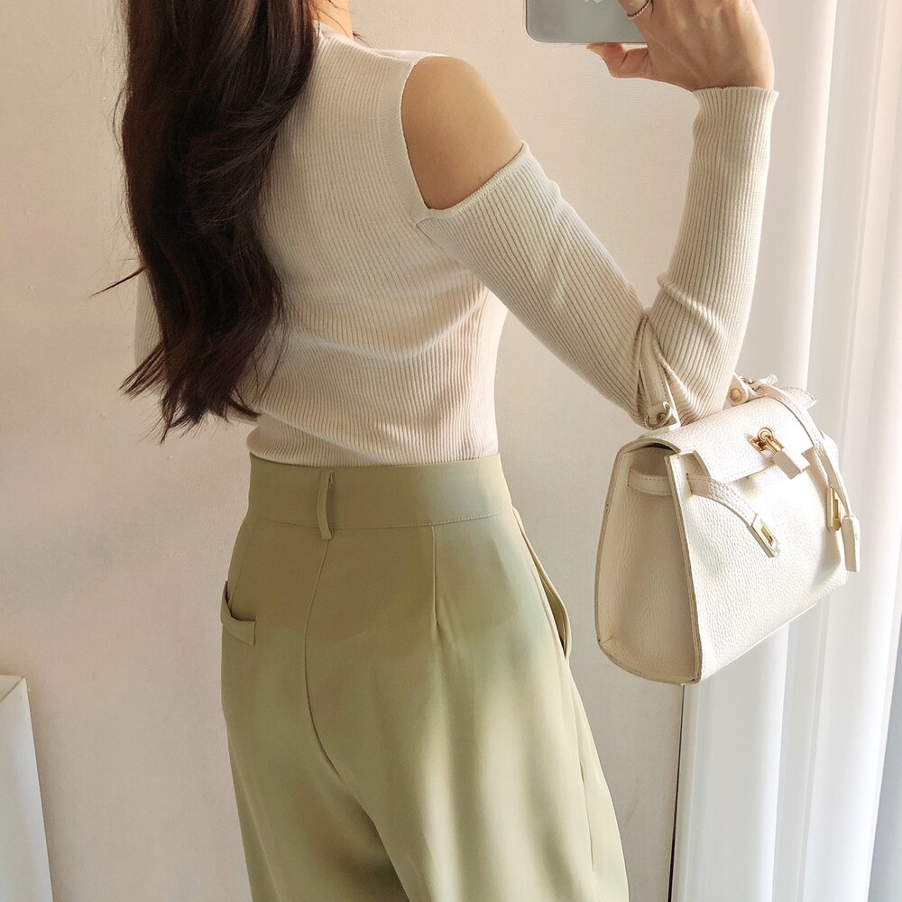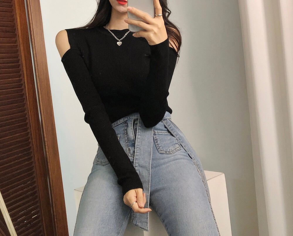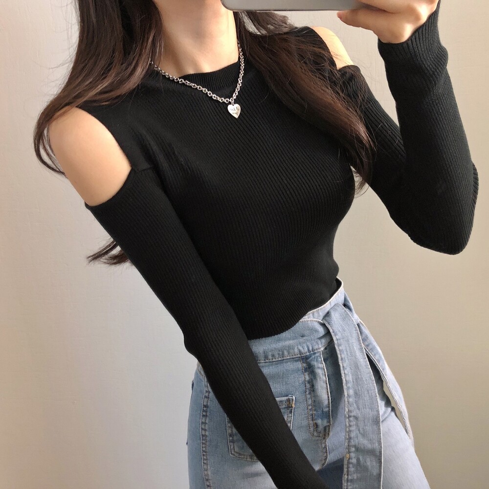섹시하고 페미닌한 스타일의 어깨트임라운트 니트예요.