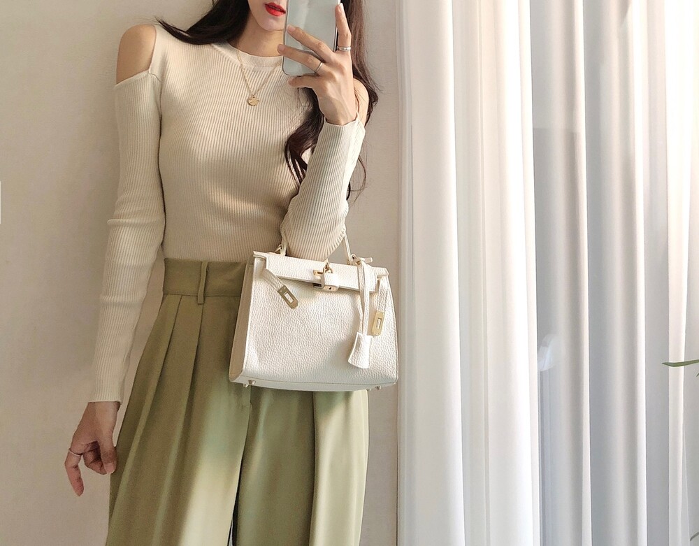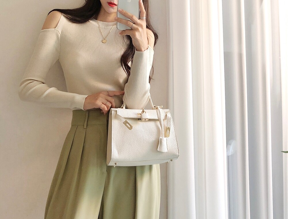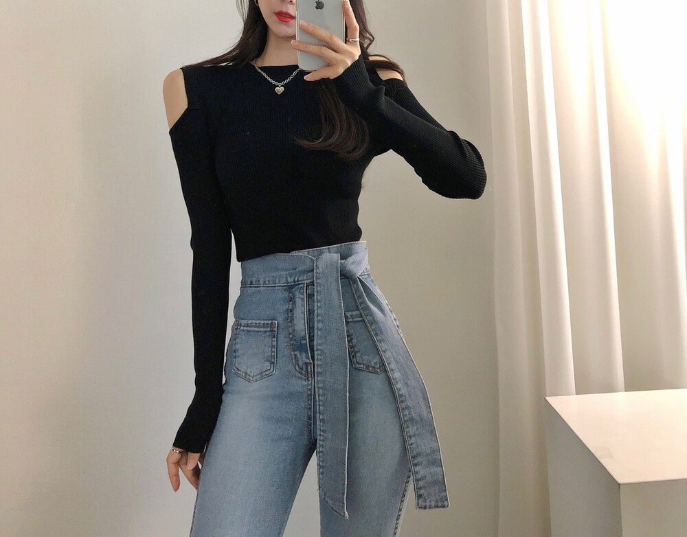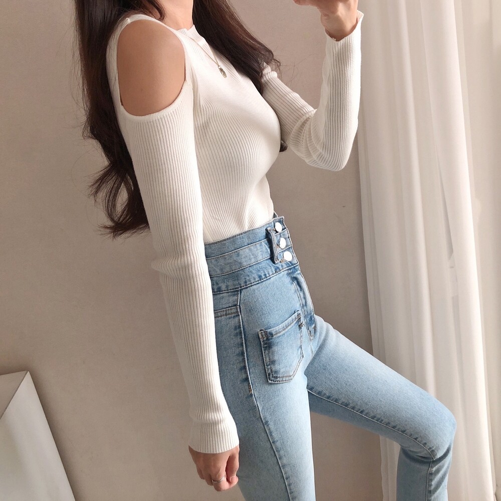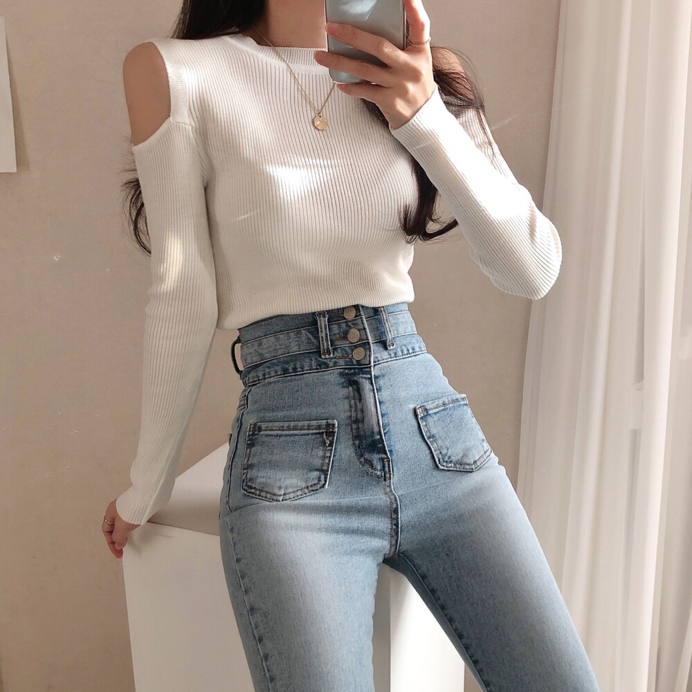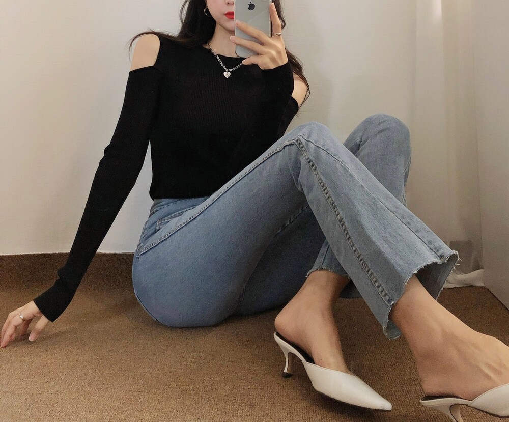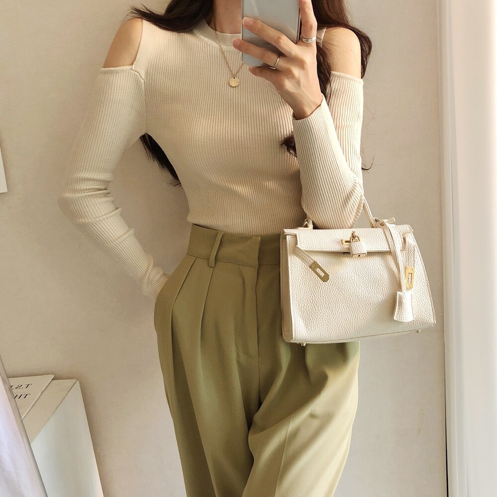 섹시하고 페미닌한 스타일의 어깨트임라운트 니트예요.