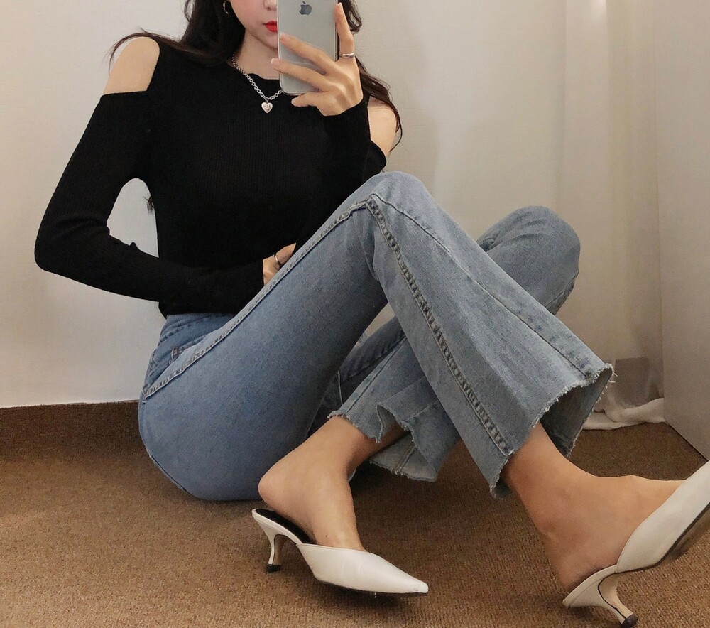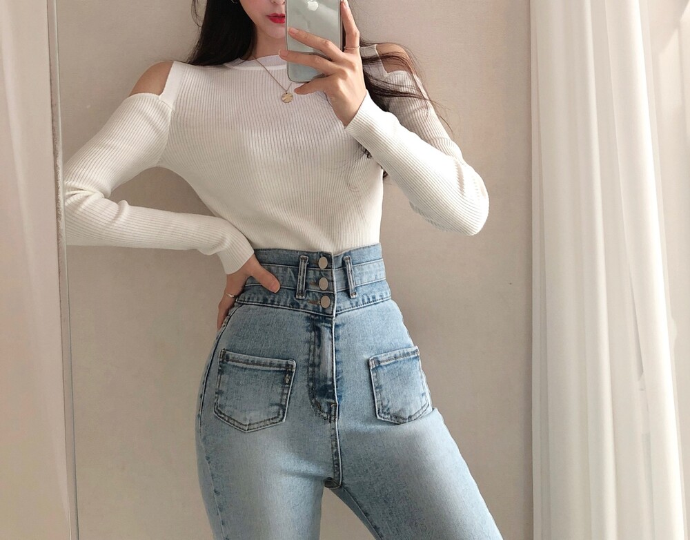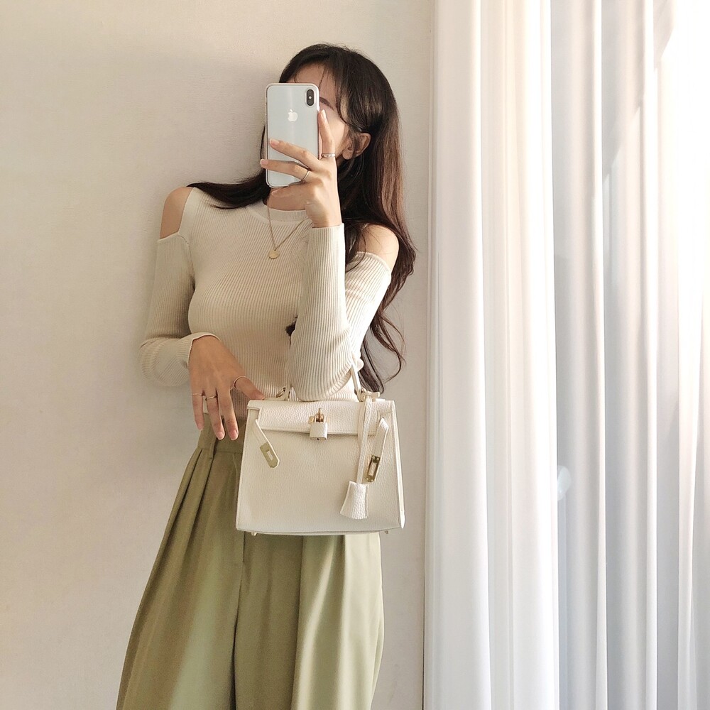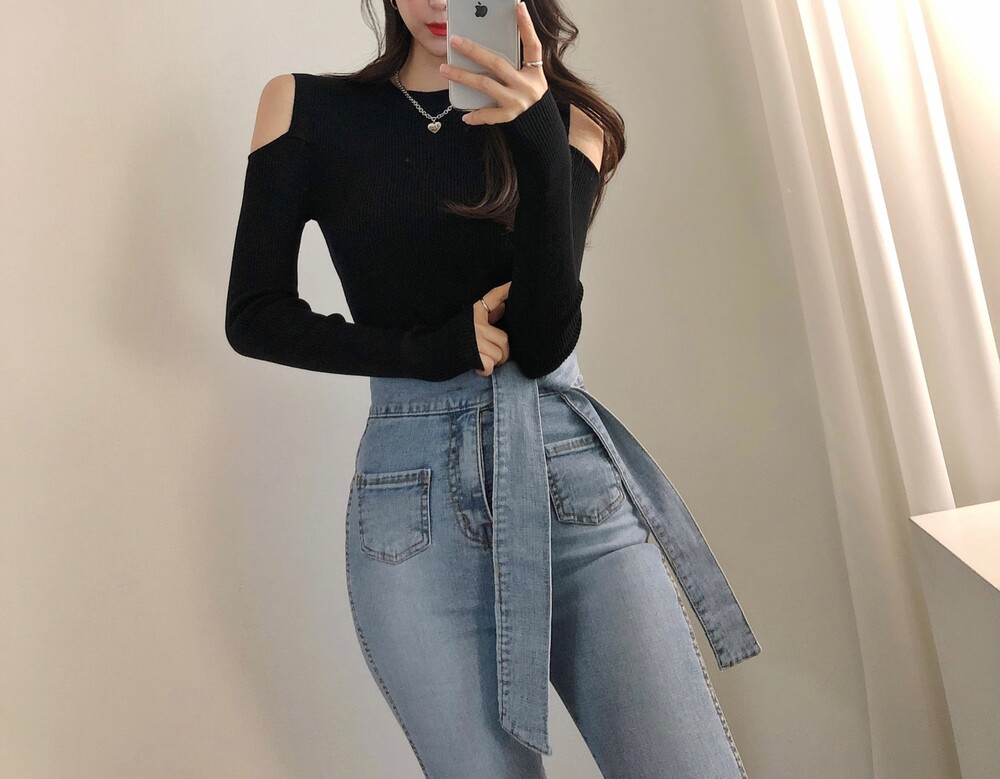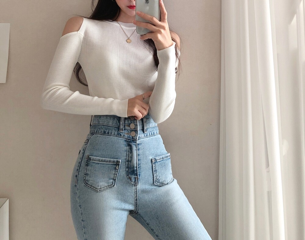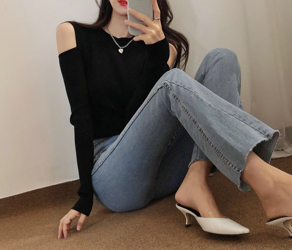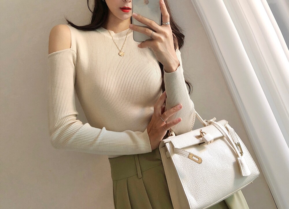 섹시하고 페미닌한 스타일의 어깨트임라운트 니트예요.