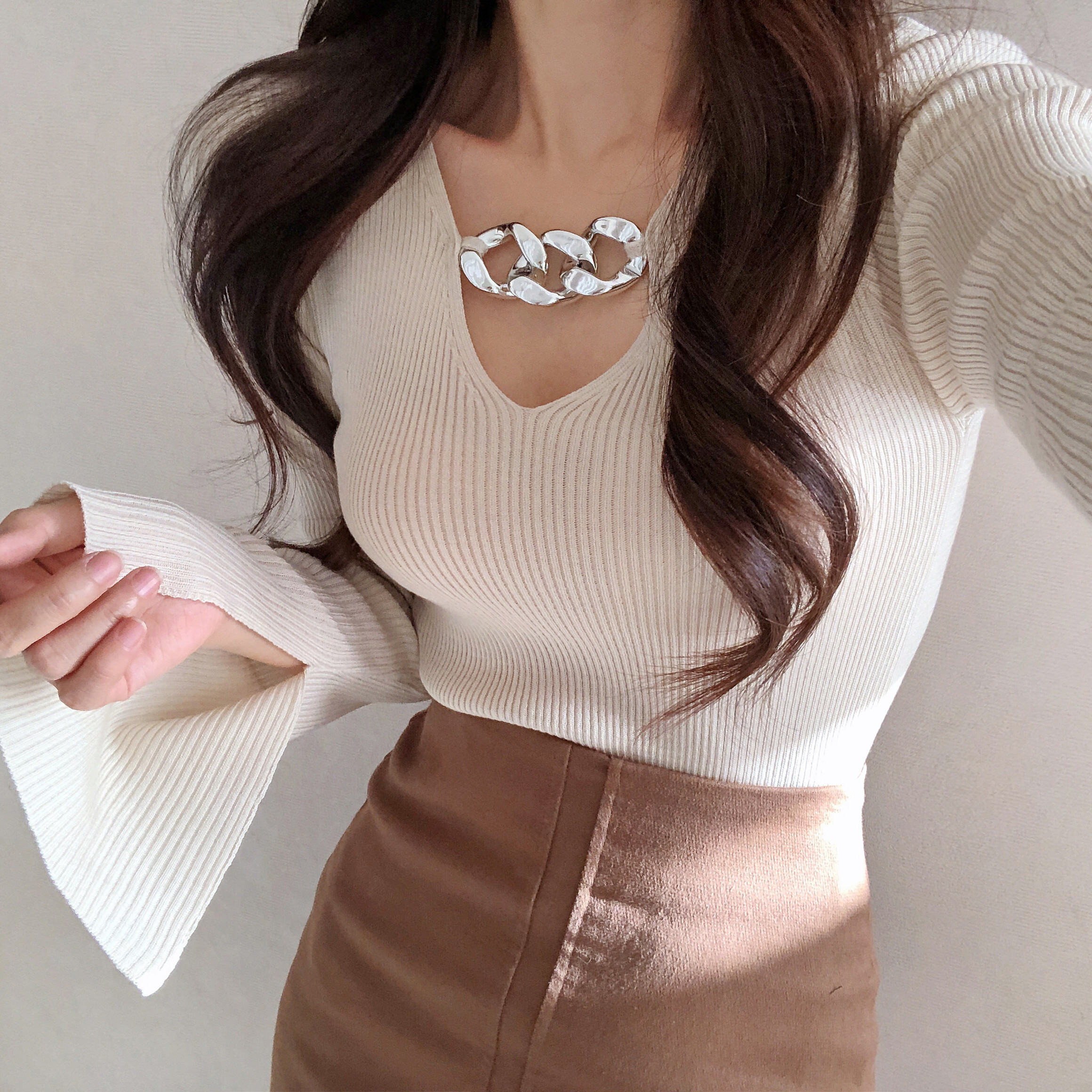 넥 라인의 볼드한 느낌의 체인은